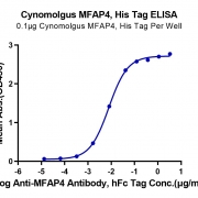 Immobilized Cynomolgus MFAP4, His Tag at 1ug/ml (100ul/Well) on the plate. Dose response curve for Anti-MFAP4 Antibody, hFc Tag with the EC50 of 7.8ng/ml determined by ELISA. See testing image for detail.