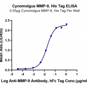 Immobilized Cynomolgus MMP-9, His Tag at 0.5ug/ml (100ul/Well) on the plate. Dose response curve for Anti-MMP-9 Antibody, hFc Tag with the EC50 of 18.8ng/ml determined by ELISA. See testing image for detail.
