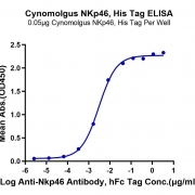 Immobilized Cynomolgus NKp46, His Tag at 0.5ug/ml (100ul/Well) on the plate. Dose response curve for Anti-NKp46 Antibody, hFc Tag with the EC50 of 3.0ng/ml determined by ELISA. See testing image for detail.