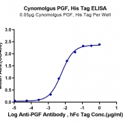 Immobilized Cynomolgus PGF, His Tag at 0.5ug/ml (100ul/well) on the plate. Dose response curve for Anti-PGF Antibody, hFc Tag with the EC50 of 6.0ng/ml determined by ELISA. See testing image for detail.