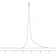 The protein has a predicted MW of 34.57 kDa. Due to glycosylation, the protein migrates to 72-82 kDa based on Tris-Bis PAGE result.