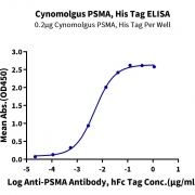 Immobilized Cynomolgus PSMA, His Tag at 2ug/ml (100ul/Well) on the plate. Dose response curve for Anti-PSMA Antibody, hFc Tag with the EC50 of 5.0ng/ml determined by ELISA (QC Test). See testing image for detail.