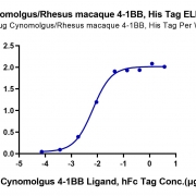 Immobilized Cynomolgus/Rhesus macaque 4-1BB, His Tag at 0.5ug/ml (100ul/Well) on the plate. Dose response curve for Cynomolgus 4-1BB Ligand, hFc Tag with the EC50 of 6.7ng/ml determined by ELISA. See testing image for detail.