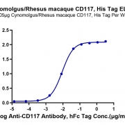 Immobilized Cynomolgus/Rhesus macaque CD117, His Tag at 0.5ug/ml (100ul/Well) on the plate. Dose response curve for Anti-CD117 Antibody, hFc Tag with the EC50 of 9.19ng/ml determined by ELISA (QC Test). See testing image for detail.