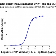 Immobilized Cynomolgus/Rhesus macaque DKK1, His Tag at 0.2ug/ml (100ul/Well) on the plate. Dose response curve for Anti-DKK1 Antibody, hFc Tag with the EC50 of 8.4ng/ml determined by ELISA. See testing image for detail.