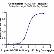 Immobilized Cynomolgus ROR2, His Tag at 0.5ug/ml (100ul/well) on the plate. Dose response curve for Anti-ROR2 Antibody, hFc Tag with the EC50 of 8.2ng/ml determined by ELISA. See testing image for detail.