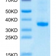 The protein has a predicted MW of 32.16 kDa. Due to glycosylation, the protein migrates to 33-38 kDa based on Tris-Bis PAGE result.
