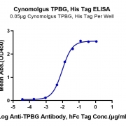 Immobilized Cynomolgus TPBG, His Tag at 0.5ug/ml (100ul/Well) on the plate. Dose response curve for Anti-TPBG Antibody, hFc Tag with the EC50 of 9.5ng/ml determined by ELISA. See testing image for detail.