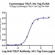Immobilized Cynomolgus TSLP, His Tag at 0.5ug/ml (100ul/Well) on the plate. Dose response curve for Anti-TSLP Antibody, hFc Tag with the EC50 of 95.0ng/ml determined by ELISA. See testing image for detail.
