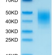 The protein has a predicted MW of 24.6 kDa. Due to glycosylation, the protein migrates to 35-55 kDa based on Tris-Bis PAGE result.
