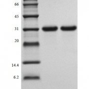 Approximately 21.6 kDa, a single non-glycosylated polypeptide chain containing 199 amino acids. But it migrates with an apparent molecular mass of 31 kDa in SDS-PAGE.