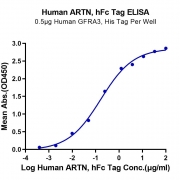 Immobilized Human GFRA3, His Tag at 5ug/ml (100ul/well) on the plate. Dose response curve for Human ARTN, hFc Tag with the EC50 of 0.17ug/ml determined by ELISA. See testing image for detail.