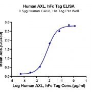 Immobilized Human GAS6, His Tag at 5ug/ml (100ul/well) on the plate. Dose response curve for Human AXL, hFc Tag with the EC50 of 7.5ng/ml determined by ELISA. See testing image for detail.
