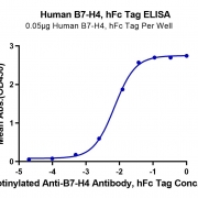Immobilized Human B7-H4, hFc Tag at 0.5ug/ml (100ul/Well) on the plate. Dose response curve for Biotinylated Anti-B7-H4 Antibody, hFc Tag with the EC50 of 7ng/ml determined by ELISA. See testing image for detail.