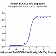 Immobilized Human BDCA-2, hFc Tag at 0.5ug/ml (100ul/well) on the plate. Dose response curve for Biotinylated Anti-BDCA-2 Antibody, hFc Tag with the EC50 of 11.8ng/ml determined by ELISA. See testing image for detail.