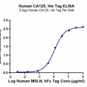 Immobilized Human CA125, His Tag at 5ug/ml (100ul/Well) on the plate. Dose response curve for Human MSLN, hFc Tag with the EC50 of 1.1ug/ml determined by ELISA. See testing image for detail.