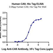 Immobilized Human CA9, His Tag at 0.9ug/ml (100ul/Well) on the plate. Dose response curve for Anti-CA9 Antibody, hFc Tag with the EC50 of 18.8ng/ml determined by ELISA. See testing image for detail.