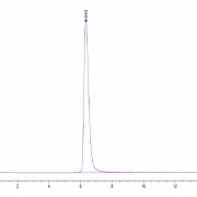 The protein has a predicted MW of 111.4 kDa. Due to glycosylation, the protein migrates to 115-130 kDa based on Tris-Bis PAGE result.