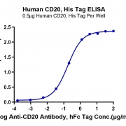 Immobilized Human CD20, His Tag at 5ug/ml (100ul/well) on the plate. Dose response curve for Anti-CD20 Antibody, hFc Tag with the EC50 of 0.17ug/ml determined by ELISA. See testing image for detail.