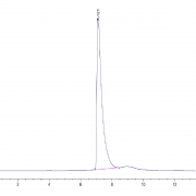 The protein has a predicted MW of 47.7 kDa. Due to glycosylation, the protein migrates to 70-80 kDa based on Tris-Bis PAGE result.