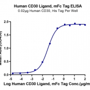 Immobilized Human CD30, His Tag at 0.2ug/ml (100ul/well) on the plate. Dose response curve for Human CD30 Ligand, mFc (IgG2a) Tag with the EC50 of 31.9ng/ml determined by ELISA. See testing image for detail.