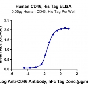 Immobilized Human CD46, His Tag at 0.5ug/ml (100ul/Well) on the plate. Dose response curve for Anti-CD46 Antibody, hFc Tag with the EC50 of 25.3ng/ml determined by ELISA. See testing image for detail.