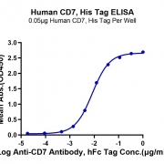 Immobilized Human CD7, His Tag at 0.5ug/ml (100ul/Well) on the plate. Dose response curve for Anti-CD7 Antibody, hFc Tag with the EC50 8.4ng/ml determined by ELISA. See testing image for detail.
