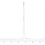 The protein has a predicted MW of 36.7 kDa. Due to glycosylation, the protein migrates to 50-60 kDa based on Tris-Bis PAGE result.