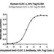 Immobilized Human CLEC-1, hFc Tag at 0.5ug/ml (100ul/Well) on the plate. Dose response curve for Biotinylated Anti-CLEC-1 Antibody, hFc Tag with the EC50 8.8ng/ml determined by ELISA. See testing image for detail.