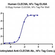 Immobilized Human CLEC9A, hFc Tag at 0.5ug/ml (100ul/Well) on the plate. Dose response curve for Biotinylated Anti-CLEC9A Antibody, hFc Tag with the EC50 of 4.4ng/ml determined by ELISA. See testing image for detail.