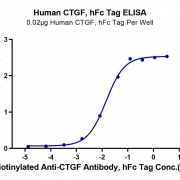 Immobilized Human CTGF, hFc Tag at 0.2ug/ml (100ul/Well) on the plate. Dose response curve for Biotinylated Anti-CTGF Antibody, hFc Tag with the EC50 of 14.2ng/ml determined by ELISA. See testing image for detail.