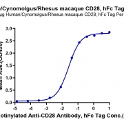 Immobilized Human/Cynomolgus/Rhesus macaque CD28, hFc Tag at 0.5ug/ml (100ul/Well) on the plate. Dose response curve for Biotinylated Anti-CD28 Antibody, hFc Tag with the EC50 of 25.6ng/ml determined by ELISA. See testing image for detail.