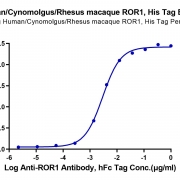 Immobilized Human/Cynomolgus/Rhesus macaque ROR1 (30-305,Ig-like&Frizzled Domain) , His Tag at 1ug/ml (100ul/well) on the plate. Dose response curve for Anti-ROR1 Antibody, hFc Tag with the EC50 of 2.9ng/ml determined by ELISA. See testing image for detail.