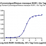 Immobilized Human/Cynomolgus/Rhesus macaque ROR1, His Tag at 1ug/ml (100ul/Well) on the plate. Dose response curve for Anti-ROR1 Antibody, hFc Tag with the EC50 of 2.7ng/ml determined by ELISA. See testing image for detail.