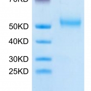 The protein has a predicted MW of 32.8 kDa. Due to glycosylation, the protein migrates to 50-60 kDa based on Tris-Bis PAGE result.