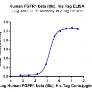 Immobilized Anti-FGFR1 Anitibody, hFc Tag at 2ug/ml (100ul/Well) on the plate. Dose response curve for Human FGFR1 beta (IIIc) , His Tag with the EC50 of 0.17ug/ml determined by ELISA. See testing image for detail.