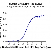 Immobilized Human GAS6, hFc Tag at 5μg/ml (100μl/Well) on the plate. Dose response curve for Biotinylated Human Axl, hFc Tag with the EC50 of 6.8ng/ml determined by ELISA. See testing image for detail.