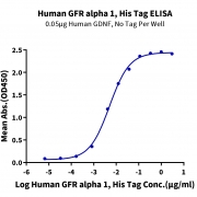 Immobilized Human GDNF, No Tag at 0.5ug/ml (100ul/well) on the plate. Dose response curve for Human GFR alpha 1, His Tag with the EC50 of 5.0ng/ml determined by ELISA. See testing image for detail.