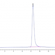 The protein has a predicted MW of 59.69 kDa. Due to enzyme lysis and glycosylation, the protein migrates to 55-65 kDa (heavy chain) and 25-30 kDa (light chain) based on Tris-Bis PAGE result.