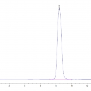 The protein has a predicted MW of 28.8 kDa. Due to glycosylation, the protein migrates to 45-60 kDa based on Tris-Bis PAGE result.
