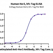 Immobilized Human Her3, hFc Tag at 0.5ug/ml (100ul/well) on the plate. Dose response curve for Biotinylated Anti-Her3 Antibody, hFc Tag with the EC50 of 12.8ng/ml determined by ELISA. See testing image for detail.