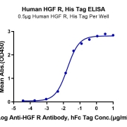 Immobilized Human HGF R, His Tag at 5ug/ml (100ul/Well) on the plate. Dose response curve for Anti-HGF R Antibody, hFc Tag with the EC50 of 17.3ng/ml determined by ELISA (QC test). See testing image for detail.