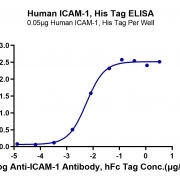 Immobilized Human ICAM-1, His Tag at 0.5ug/ml (100ul/Well) on the plate. Dose response curve for Anti-ICAM-1 Antibody, hFc Tag with the EC50 of 5.6ng/ml determined by ELISA. See testing image for detail.