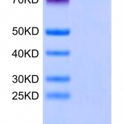 The protein has a predicted MW of 50.54 kDa. Due to glycosylation, the protein migrates to 80-110 kDa based on Tris-Bis PAGE result.