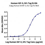 Immobilized Human IGFBP-3, His Tag at 2ug/ml (100ul/well) on the plate. Dose response curve for Human IGF II, hFc Tag with the EC50 of 0.14ug/ml determined by ELISA. See testing image for detail.
