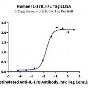 Immobilized Human IL-17B, hFc Tag at 0.5ug/ml (100ul/well) on the plate. Dose response curve for Biotinylated Anti-IL-17B Antibody, hFc Tag with the EC50 of 16.1ng/ml determined by ELISA. See testing image for detail.