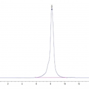 The protein has a predicted MW of 53.55 kDa. Due to glycosylation, the protein migrates to 75-105 kDa based on Tris-Bis PAGE result.