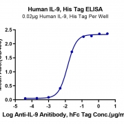 Immobilized Human IL-9, His Tag at 0.2ug/ml (100ul/Well) on the plate. Dose response curve for Anti-IL-9 Anitibody, hFc Tag with the EC50 of 13.6ng/ml determined by ELISA. See testing image for detail.