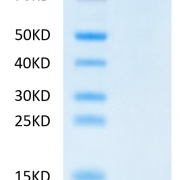 The protein has a predicted MW of 111.56 kDa. Due to glycosylation, the protein migrates to 120-140 kDa based on Tris-Bis PAGE result.