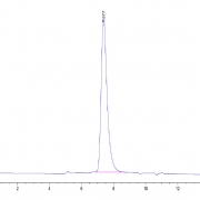 The protein has a predicted MW of 27.4 kDa. Due to glycosylation, the protein migrates to 45-50 kDa based on Tris-Bis PAGE result.